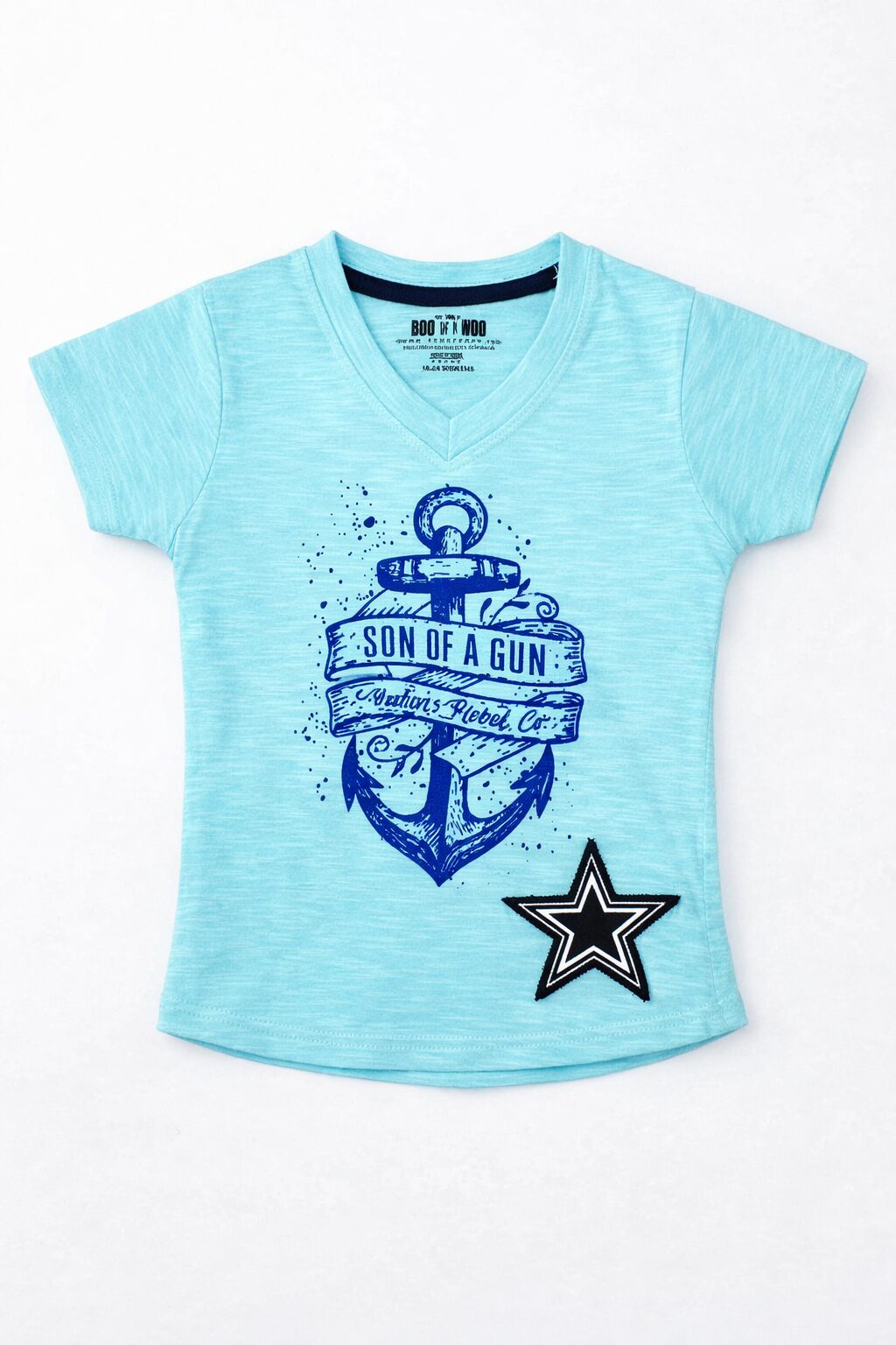 Add a fresh and adventurous vibe to your child’s wardrobe with the Anchor Graphic Kids Cotton T-Shirt. Designed in a refreshing aqua blue shade, this tee features a bold anchor-inspired “Son of a Gun” graphic, giving it a trendy nautical and street-style appeal.