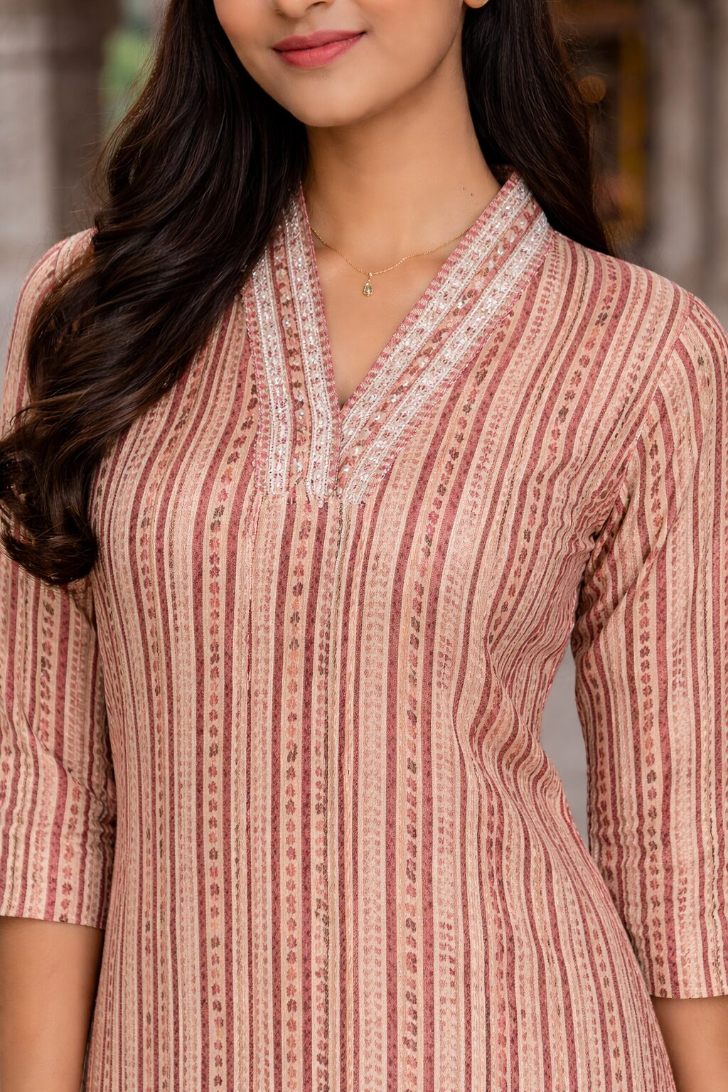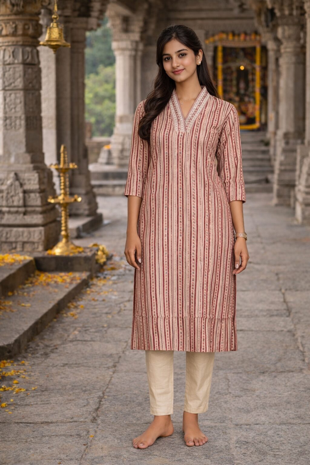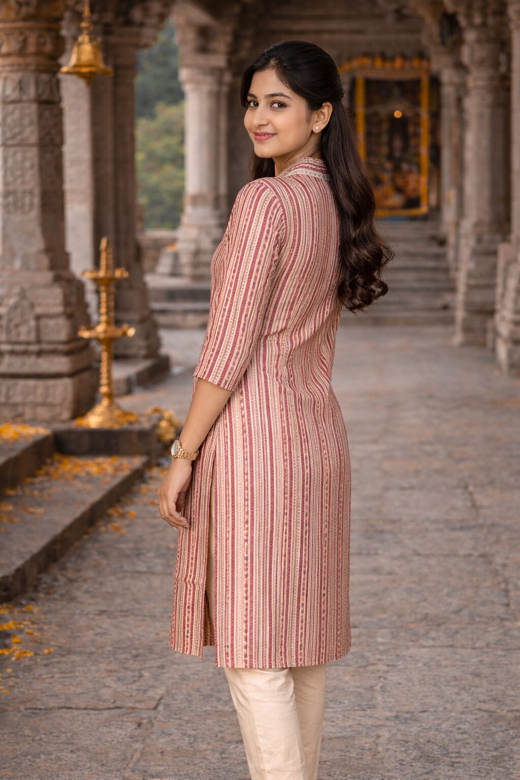 Elegant Beige & Rust Vertical Stripe Cotton Kurti with Minimal Ethnic Pattern