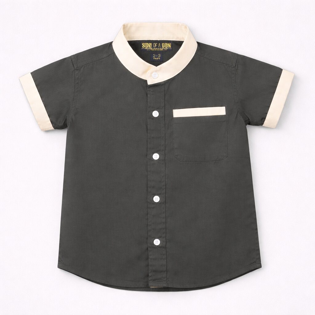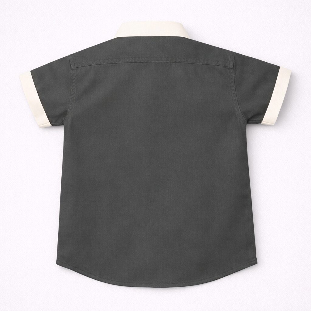 Keep it simple yet stylish with the Classic Contrast Kids Cotton Shirt, designed for a refined and polished appearance. Featuring a solid charcoal base, this shirt is elevated with contrast beige collar, sleeve cuffs, and pocket detail, giving it a premium and modern finish.