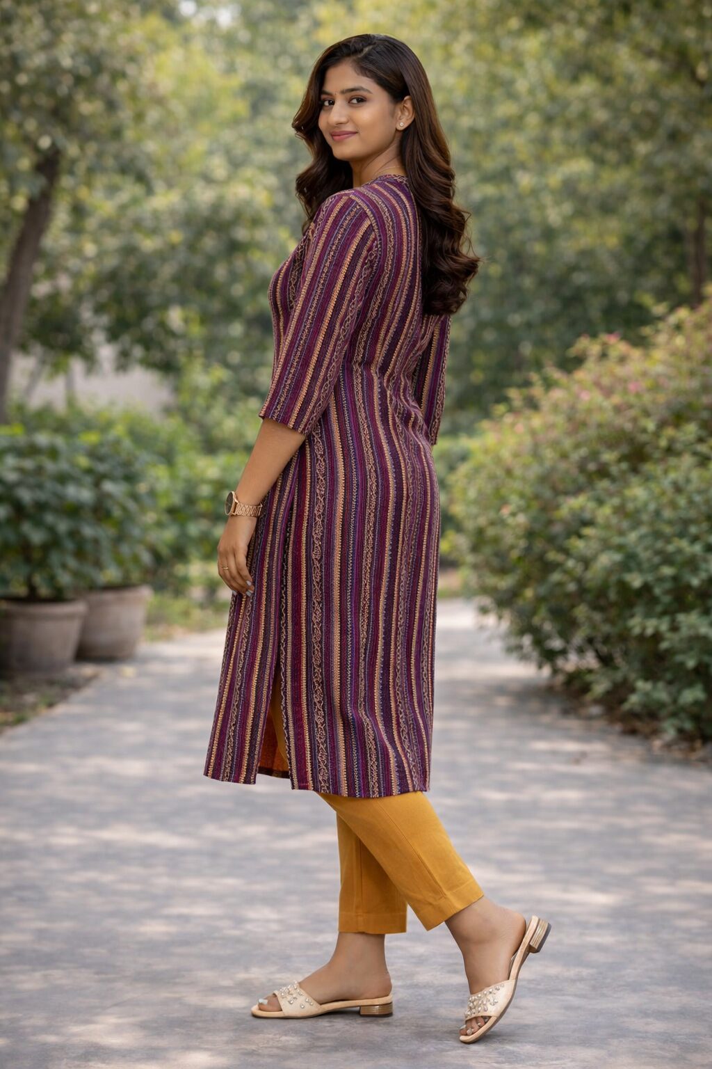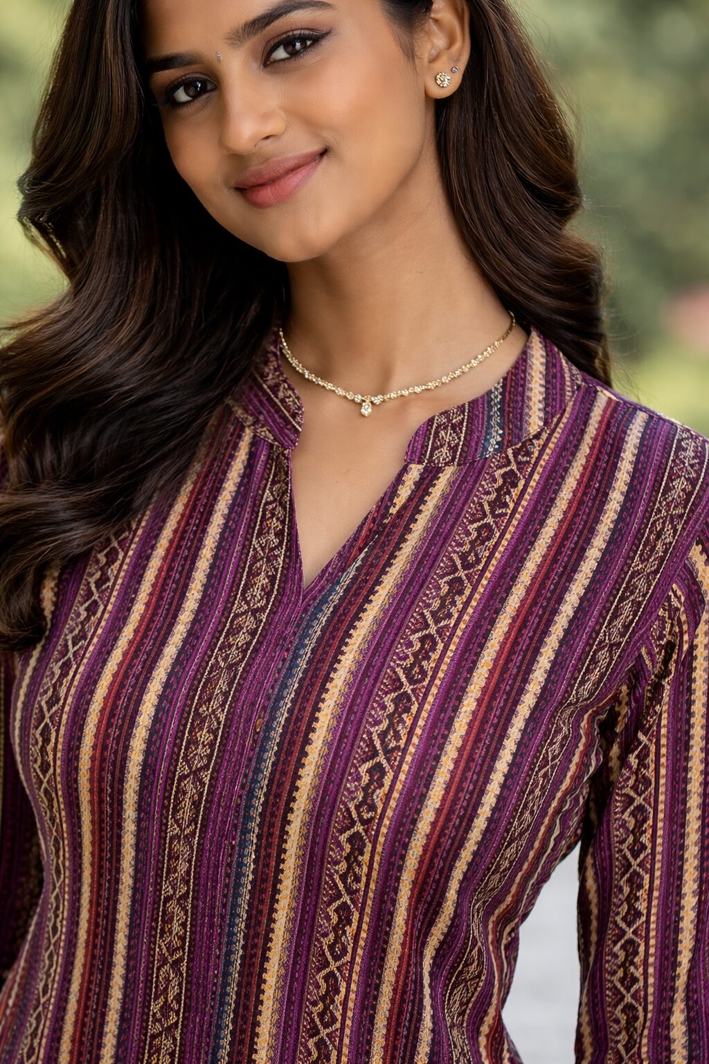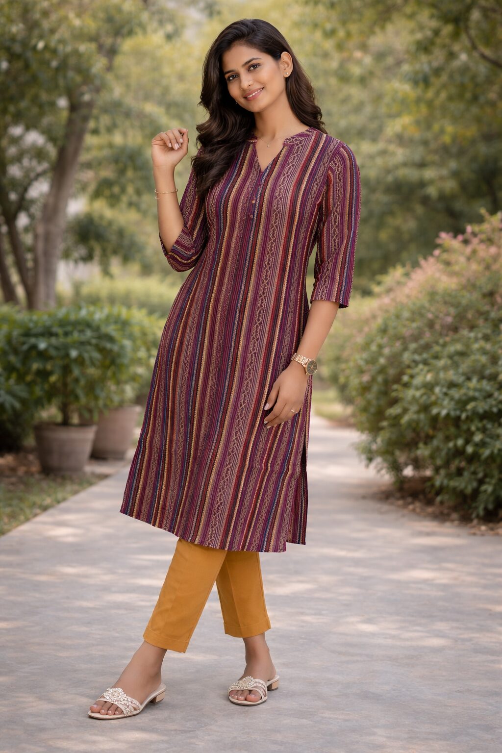 Elegant Plum & Mustard Ethnic Stripe Cotton Kurti with Classic Pattern